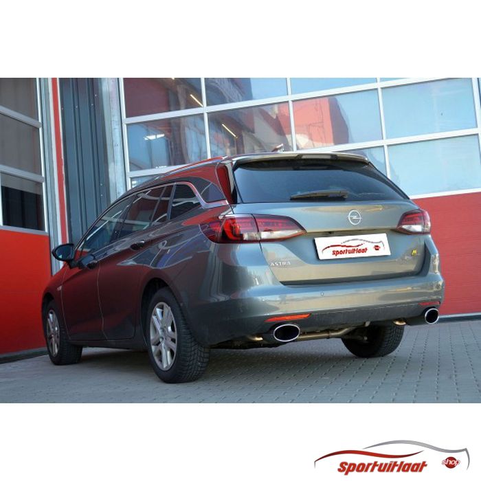 RVS CatBack Sportuitlaat passend voor de Opel ASTRA K Sports Tourer bouwjaar 2015-2021 met een duplex 2x eindsierstuk in de uitvoering 90x120mm ovaal-scheef-LR. Zie (laatste) afbeelding eindsierstuk voor juiste uitvoering.