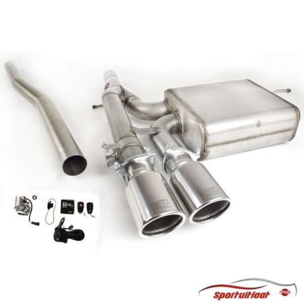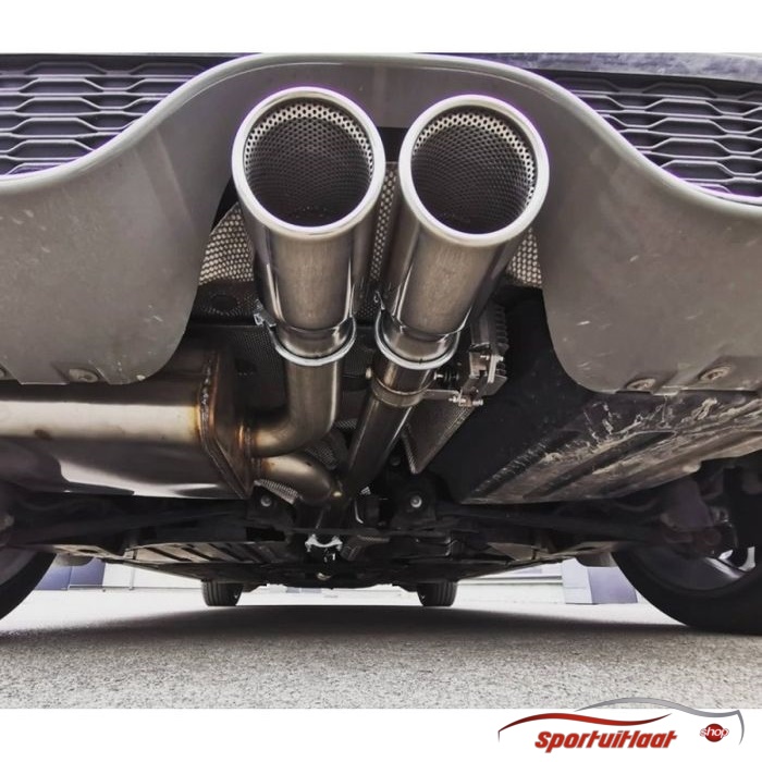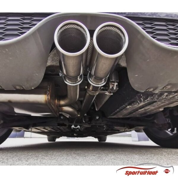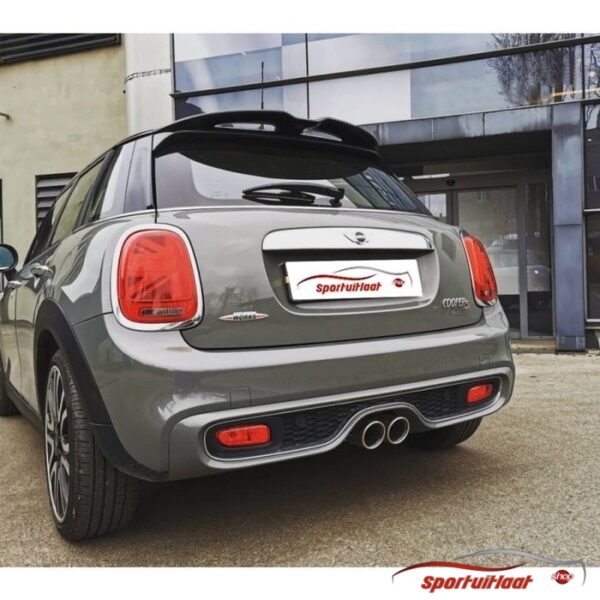 RVS Sportuitlaat passend voor de Mini Cooper S (F55) bouwjaar 2002-2006 met een 2x eindsierstuk in de uitvoering 90mm rond-schuin. Zie (laatste) afbeelding eindsierstuk voor juiste uitvoering.Motoruitvoering:– 2.0 141kWPassing: – NB: Deze Sportuitlaat is in volledig RVS uitgevoerd!– Deze Sportuitlaat bestaat uit een geïntegreerd kleppensysteem dat op afstand bedienbaar is !– Door dit kleppensysteem krijgt u op het moment dat u wenst (of wanneer het kan) een extra Racey Sportieve Sound. Of zodra u een woonwijk inrijdt, kunt u met 1 druk op de knop (afstandbediening wordt meegeleverd) het volume van de Sportuitlaat terugdraaien naar acceptabel niveau voor de omgeving. Hierdoor heeft de Sportuitlaat met de klep dicht ook een E-keur en doorstaat de Goca Attest, TüV en APK.– De klep in het systeem is een By-Pass systeem, d.w.z. de uitlaatgassen worden met de klep open om de demper heen geleid om vervolgens weer door de oorspronkelijke eindsierstukken naar buiten te komen. De uitlaatgassen worden dus niet halverwege het uitlaatsysteem naar buiten geleid (Cut-Out methode), maar omgeleid. Hiermee is het totale systeem gegarandeerd voor 100% gasdicht en daarmee APK-proof.– GARANTIE: 5 jaar op Sportuitlaat, 1 jaar op kleppensysteem.