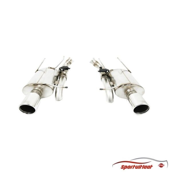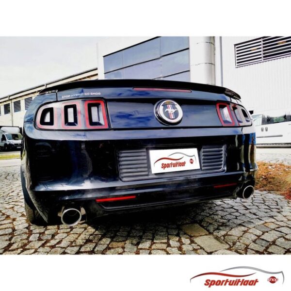 RVS Sportuitlaat met geïntegreerd kleppensysteem passend voor de Ford MUSTANG V bouwjaar 2010-2014 met een duplex 2x eindsierstuk in de uitvoering 100mm rond-schuin. Zie (laatste) afbeelding eindsierstuk voor juiste uitvoering.Motoruitvoering:– 3.7 V6 227kWPassing: – NB: Deze Sportuitlaat is in volledig RVS uitgevoerd!– Deze Sportuitlaat bestaat uit een geïntegreerd kleppensysteem dat op afstand bedienbaar is !– Door dit kleppensysteem krijgt u op het moment dat u wenst (of wanneer het kan) een extra Racey Sportieve Sound. Of zodra u een woonwijk inrijdt, kunt u met 1 druk op de knop (afstandbediening wordt meegeleverd) het volume van de Sportuitlaat terugdraaien naar acceptabel niveau voor de omgeving. Hierdoor heeft de Sportuitlaat met de klep dicht ook een E-keur en doorstaat de Goca Attest, TüV en APK.– De klep in het systeem is een By-Pass systeem, d.w.z. de uitlaatgassen worden met de klep open om de demper heen geleid om vervolgens weer door de oorspronkelijke eindsierstukken naar buiten te komen. De uitlaatgassen worden dus niet halverwege het uitlaatsysteem naar buiten geleid (Cut-Out methode), maar omgeleid. Hiermee is het totale systeem gegarandeerd voor 100% gasdicht en daarmee APK-proof.– GARANTIE: 5 jaar op Sportuitlaat, 1 jaar op kleppensysteem.