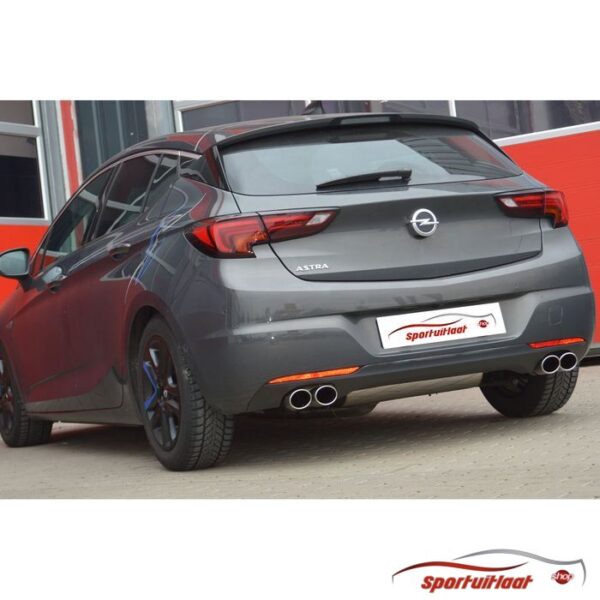 RVS Sportuitlaat passend voor de Opel ASTRA K bouwjaar 2015-2021 met een duplex 4x eindsierstuk in de uitvoering 76mm rond-scheef-LR. Zie (laatste) afbeelding eindsierstuk voor juiste uitvoering.